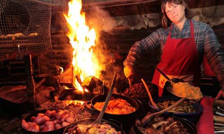 Feast of Reindeer: - voorgerecht: Lapse paddestoelensoep - hoofdgerecht: traditionele Lapse delicatessen, bereid op het vuur, waaronder rendierworstjes, gebraden rendier, varkens spare ribs, zalm, aardappelpuree en gebakken aardappels, wilde champignon salade, bosbessen en Kammi´s ingelegde augurken. - dessert: crêpes met jam en slagroom |