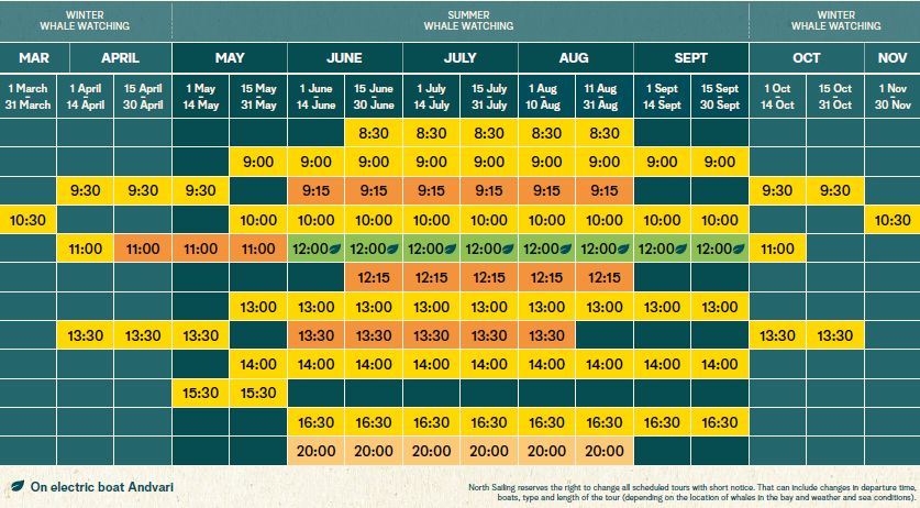 Vanuit de haven van Husavik, de walvishoofdstad van Noord-IJsland, vertrekken dagelijks tours waarbij je 98% kans hebt dat je daadwerkelijk walvissen ziet. Tevens worden er vaak dolfijnen, verschillende soorten zeevogels en veel papegaaiduikers gespot. De maatschappij waar wij mee samenwerken heeft een World Responsible Tourism Award ontvangen voor haar beleid om zoveel mogelijk klimaatneutraal te opereren met een minimum aan CO2 uitstoot. Je kunt ook ook kiezen voor een Silent Whale Watching tour met de Andvari, een elektrische schip (groene afvaarten) of een combinatie tour, waarbij ook op zoek wordt gegaan naar papegaaiduikertjes (oranje afvaarten).