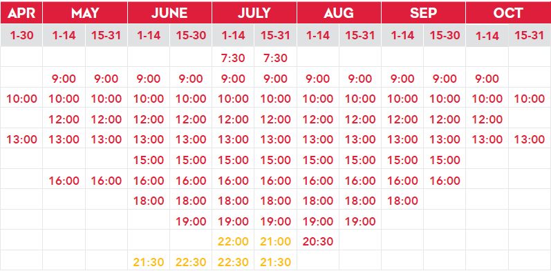 Van 1/6-31/7 kun je ook boeken voor een Midnight Sun Whale Watching tour (gele afvaarten).