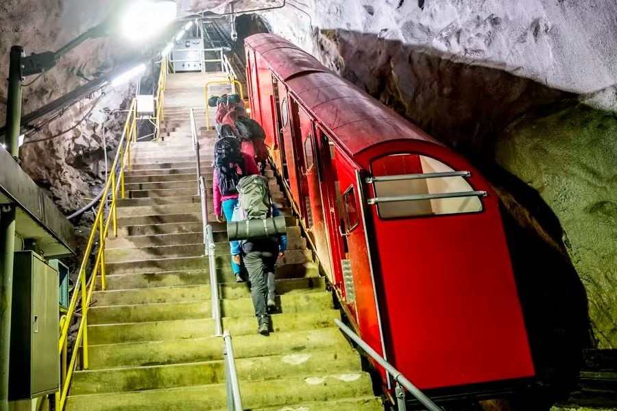 Eenmaal boven kun je kiezen; ski op eigen risico via de off-piste naar beneden, of neem de trein terug door de berg en geniet nog een keer van deze unieke reis.