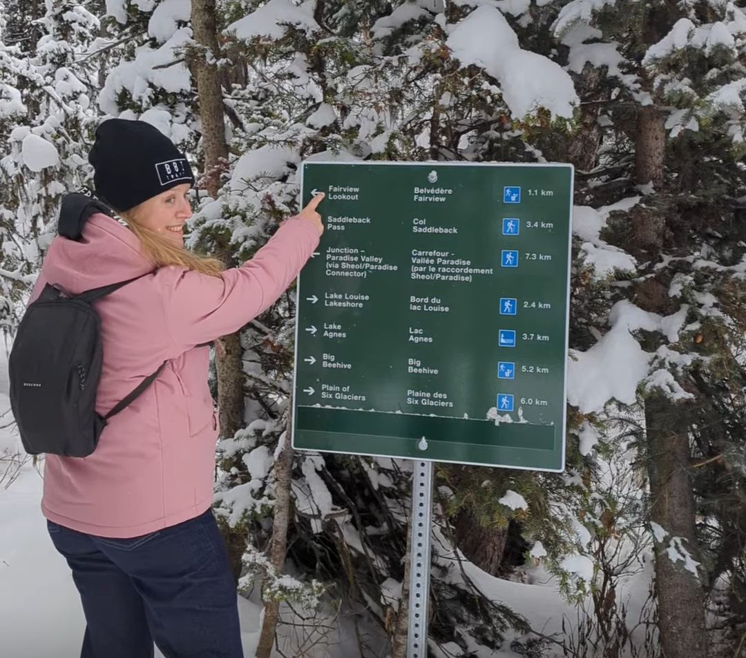 Je bent tijdens een reis naar Banff midden in een van de grootste en meest bekende nationale parken van Canada. Dus een dagje erop uit gaan om al die natuurpracht te bewonderen is een absolute must. Nu is Canada in de zomer natuurlijk een walhalla voor hikers, maar in de winter is wandelen ook fantastisch. En met de toegevoegde winterelementen is het juist een hele bijzondere ervaring. Zo hebben Myrthe en ik twee wandelingen gemaakt tijdens onze reis, een bij Lake Louise en een in Johnston Canyon. De wandeling bij Lake Louise hebben we op eigen houtje gedaan, met enkel een paar spikes onder de schoenen om ons door de sneeuw te helpen. Als je vanaf het meer linksaf gaat vind je meerdere bordjes die je in de richting van verschillende trails sturen. Wij hebben de trail naar de Fairview Lookout gedaan, de kortste route die je aan het eind een heel mooi uitzicht over het meer en de beroemde Fairmont Chateau geeft. En we konden zelfs de pistes van Lake Louise in de verte zien liggen! De spikes, die de Canadesen "cleats" noemen, kan je huren bij de Fairmont Chateau direct aan het meer. Hier kan je ook terecht voor schaatshuur. Hartje winter maken ze namelijk een mooi stukje op het meer sneeuwvrij zodat je er kan schaatsen.