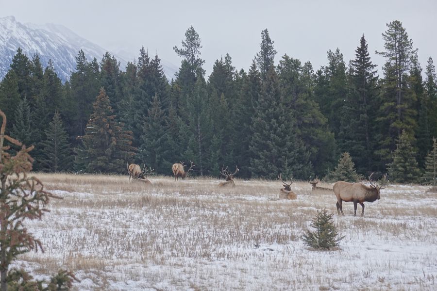 Wildlife zal waarschijnlijk niet het eerste zijn waar je aan denkt in de winter, want dan zijn de dieren tenslotte in winterslaap, toch? Nee, lang niet allemaal! Zelfs de beren zijn niet 100% in winterslaap, maar in iets dat heet "denning", waarbij ze nog wel zo nu en dan even wakker kunnen worden. Nu hadden we wel een beetje onze twijfels (en verwachtte we zeker geen beren) toen we op een wildlife tour gingen, maar binnen no time had onze gids (die de omgeving natuurlijk heel goed kent) al de eerste herten voor ons gevonden. Het begon met in de verte, maar hoe verder we buiten het dorp reden hoe dichterbij we kwamen. Officieel mogen voertuigen niet stoppen aan de kant van de weg om wildlife te bekijken, wat onze gids oploste door gewoon heel, heel langzaam te rijden. En wanneer er niemand in de buurt was stopte de bus stiekem toch even. We hadden geluk, een hele groep "stags" (jonge mannetjes herten) had zich verzameld in een veld en liep of lag er prachtig bij voor ons om te bewonderen en te fotograferen. Verder hebben we ook een paar berggeiten kunnen spotten, die snel de berg op hobbelden als er een auto aan kwam en vervolgens snel weer naar beneden als de kust veilig was. Het is natuurlijk altijd leuk om dieren tegen te komen in Canada. Tijdens mijn vorige reis naar Banff had ik zelfs het geluk om een paar muilherten tegen te komen die gewoon over Banff Avenue liepen! Maar de tour was eigenlijk vooral leuk vanwege de vele meren, rivieren, bergen en uitkijkpunten waar we langs reden. Daar vertel ik in het volgende kopje meer over!