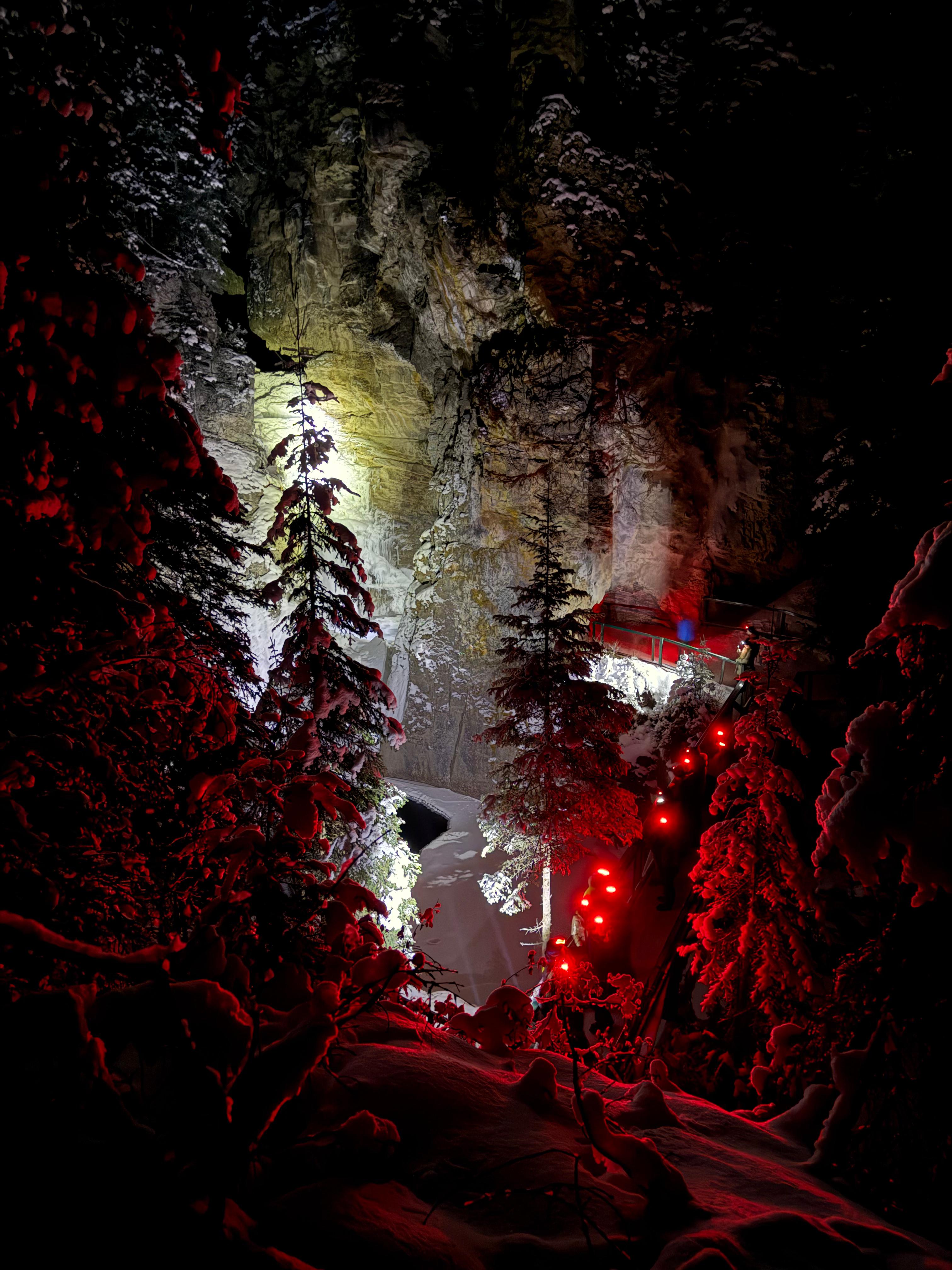 De ijswandeling in Johnston Canyon hebben we onder begeleiding van een gids gedaan. Hier organiseren ze namelijk avondtours voor. Gewapend met een hoofdlampje wandel je de nacht in en die nacht is echt veel donkerder dan we in Nederland gewend zijn! Er is namelijk bijna geen lichtvervuiling in het nationale park, dus zonder lamp zie je echt geen hand voor ogen. We werden met een fijn tourbusje vanaf Banff naar Johnston Canyon gebracht. Onderweg vertelde de gids al heel levendig over de omgeving en reed ze even wat langzamer om ons te wijzen op herten die langs de weg liepen. Op de parkeerplaats voor Johnston Canyon zagen we zelfs een vosje langs rennen! Vervolgens begon de wandeling en na een klein stukje door het bos kwamen we al bij de eerste beekjes en watervallen. Johnston Canyon bestaat uit twee grote watervallen, de zogehete Upper Falls en Lower Falls, en tussendoor een lang, kabbelend beekje waar je langs loopt. Onze avond tour ging maar tot de Lower Falls, maar deze waren al heel spectaculair. We liepen ook gebukt door een kleine grot en aan het eind stonden we echt vlak voor de watervallen, die met groot geweld naar beneden storten. Een heel bijzonder gezicht, als je daar met een groep staat met allemaal hoofdlampjes op, en al dat licht schijnt op het water. Zeker als iedereen de lampjes op rood zet, zoals je hieronder kan zien.